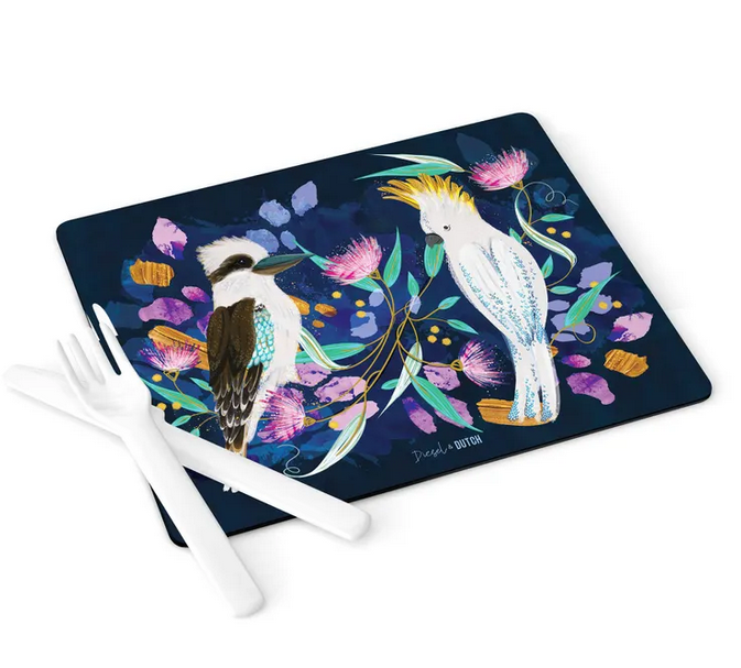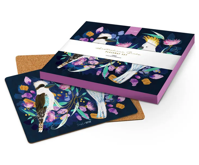 Bring the beauty of Australia's iconic birds into your dining space with the Australiana Birds Placemats Set/4. Milly and Mae Designs showcase the Kookaburra and Sulphur Crested Cockatoo amidst a vibrant floral backdrop, printed on cork placemats perfect for indoor or outdoor use. Withstanding temperatures up to 80c, these placemats add both style and practicality to your table setting.