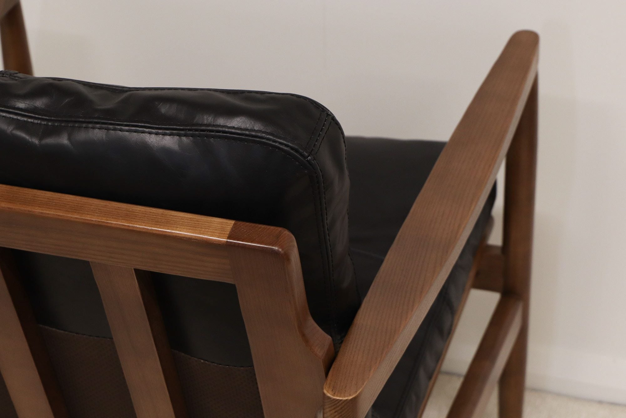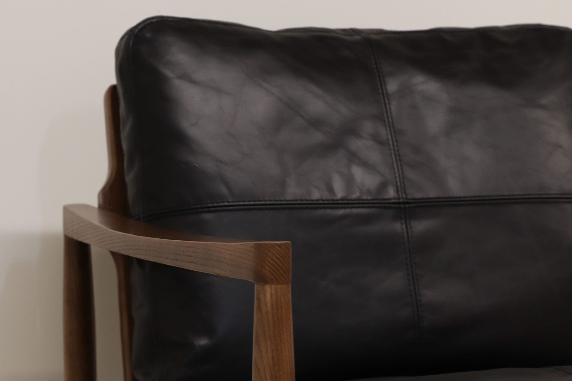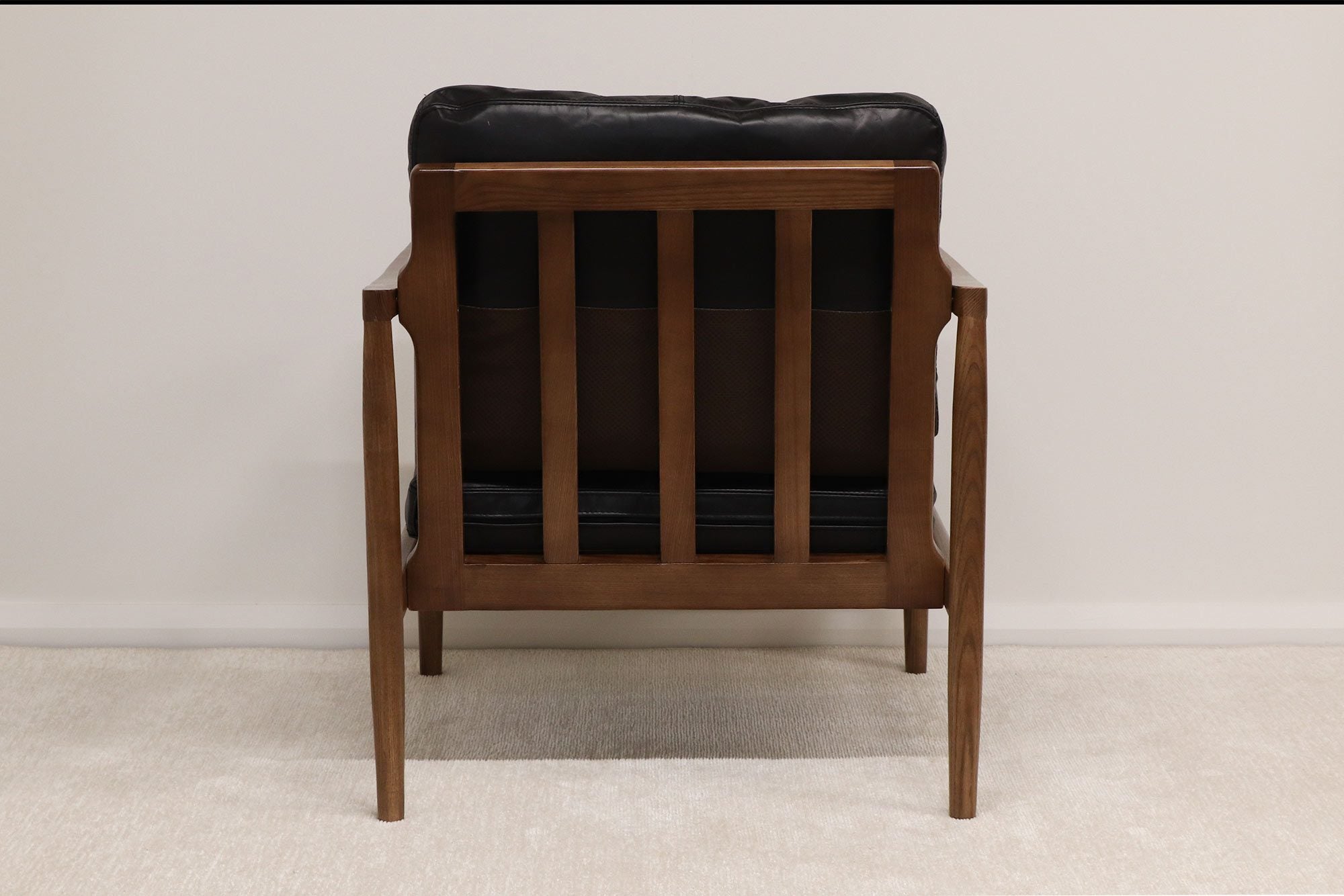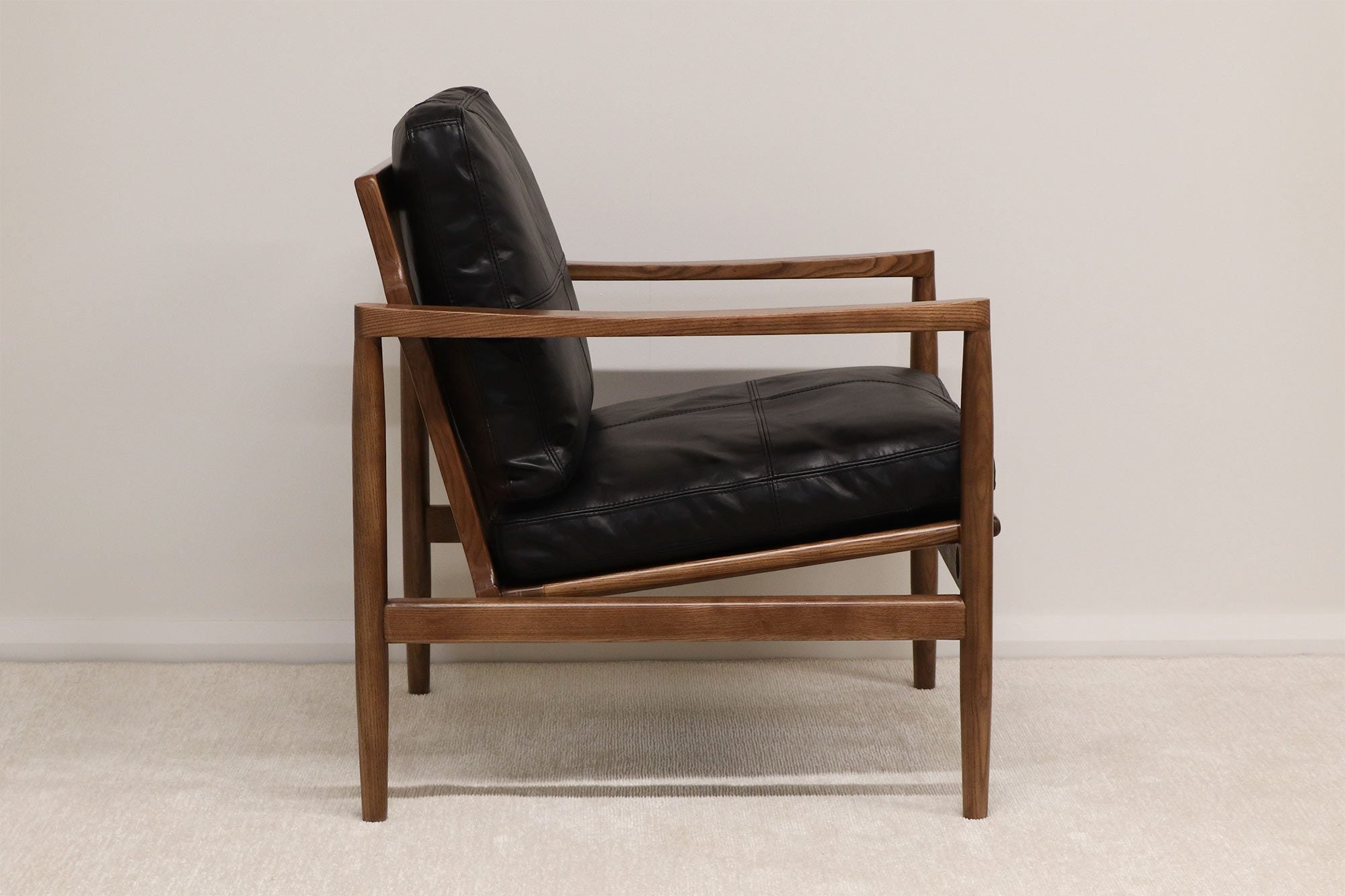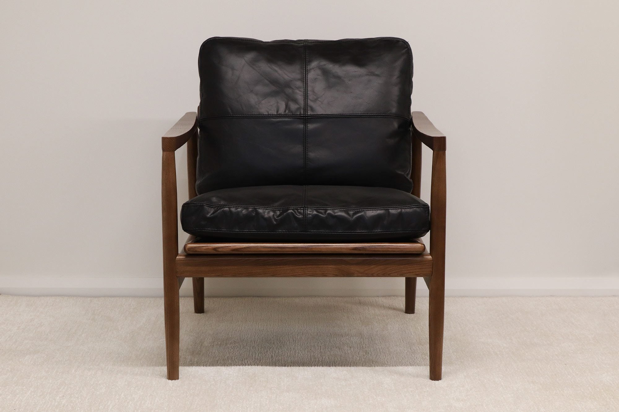 Experience superior craftsmanship in the quality genuine leather and plush comfort of this armchair. With its relaxed, but traditional look, you'll rest easy with the overstuffed cushions perfect for those coveted catnaps. Expertly crafted in North American ash with a Walnut finish, this piece is offered in Saddle and Black leather colors.