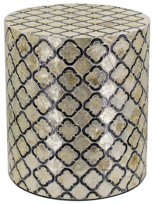 With diamond patterning through the black and cream frame, this round accent stool with Capiz inlay is attractive and sensible.