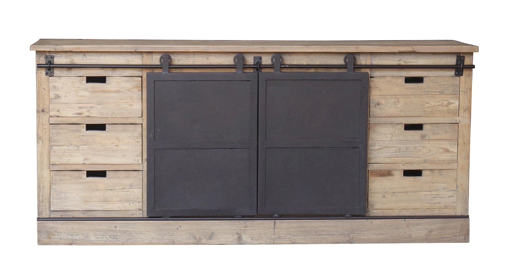 Store your dining essentials in style with this 6 drawer reclaimed pine buffet. Featuring rustic metal hardware and sliding barn doors, this versatile piece offers a natural yet contemporary look. Perfect for any sized dining area and providing ample storage space, this buffet is designed to seamlessly blend form and function.