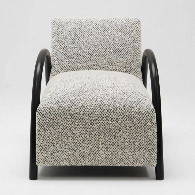 Make a bold architectural statement with the Cannon Occasional Chair. A masterclass in sculptural design, this piece juxtaposes the soft, organic texture of bouclé-inspired upholstery against the sharp, clean lines of a jet-black frame. Its low-profile silhouette and dramatic curved armrests make it a standout addition to any contemporary living room, office, or curated reading nook.