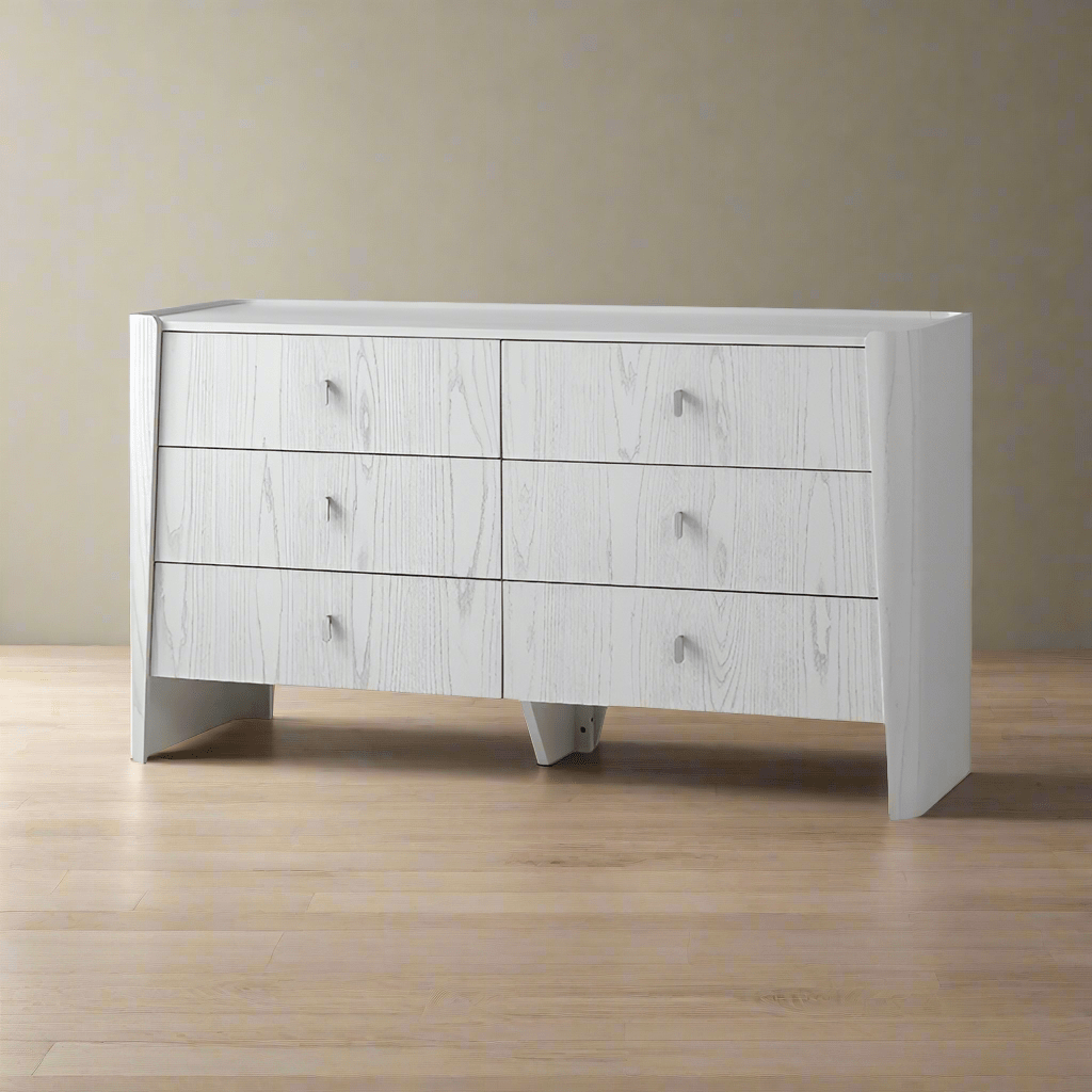 Introducing the Catalena 6 Drawer Dresser, in sleek grey or white. Crafted with a durable mix of Oak Veneer and MDF, this dresser brings style and function to any bedroom. Keep your belongings organized and elevate your space with this elegant piece.
