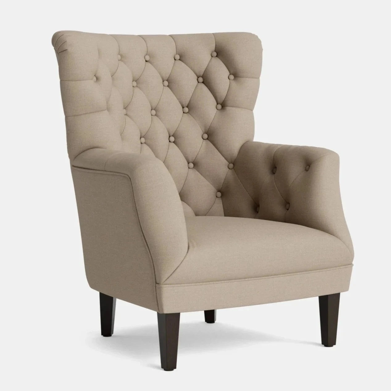 Step into the world of classic vintage and ultimate comfort with the Chesterfield Wingback Armchair. Its soft, calico exterior and generous foam padding offer both style and support for the perfect relaxation experience.