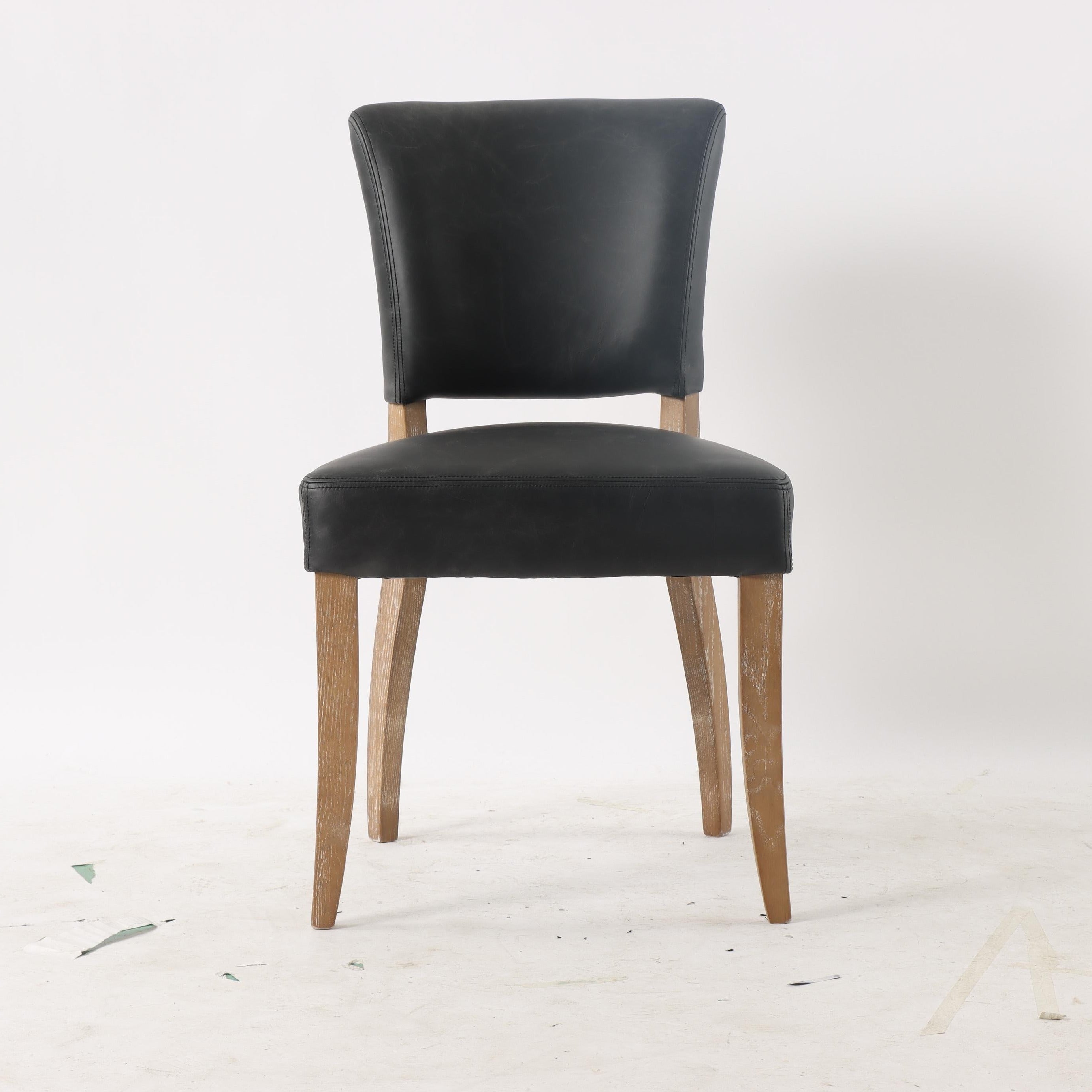 Introducing the Ezra Leather Dining Chair in Vintage Black. Made from full grain leather and a reclaimed oak frame, this chair is a statement piece with luxurious details. The brass studs add a touch of elegance to any dining space. Elevate your dining experience with Derringer.