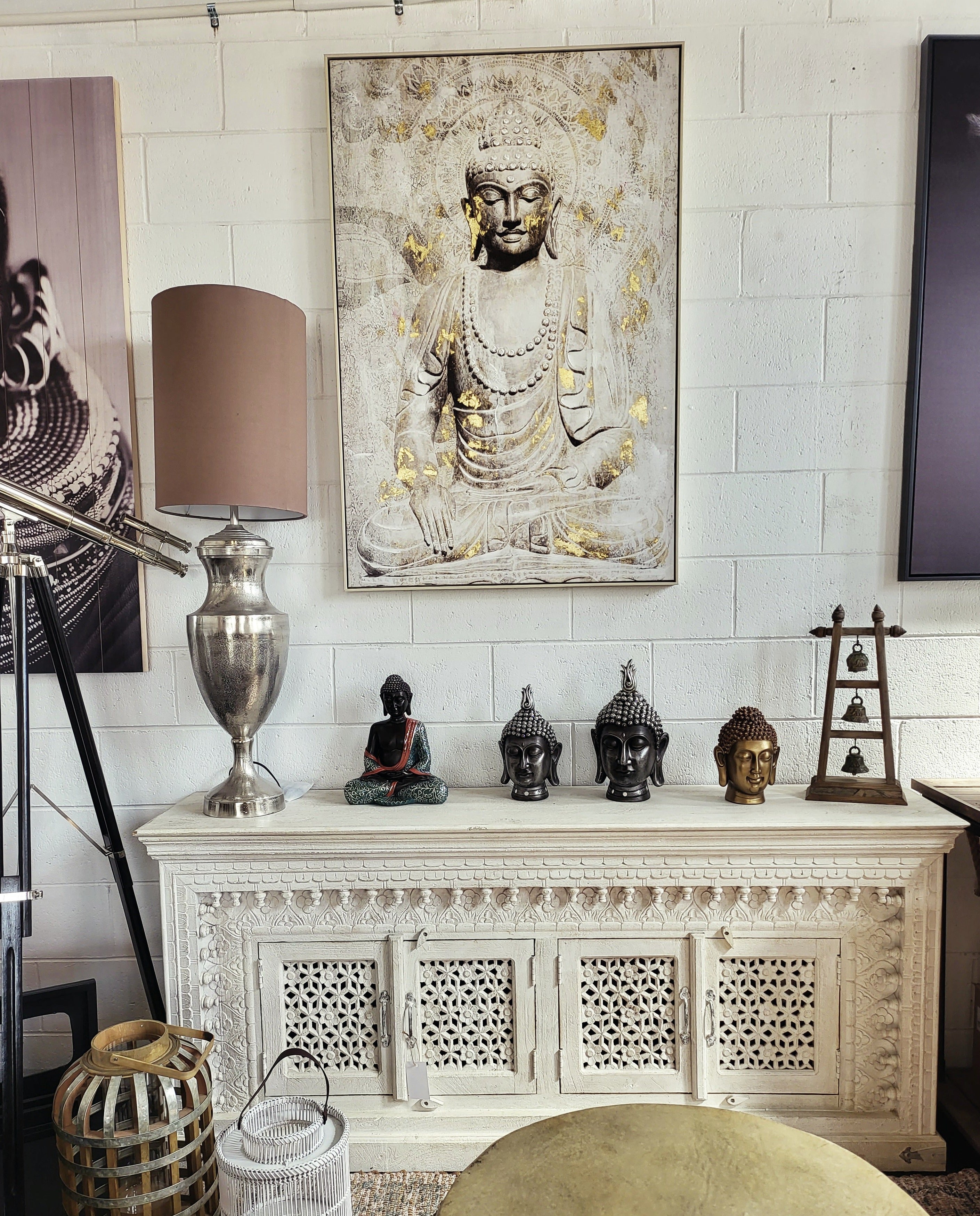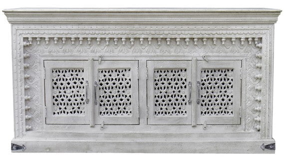 Bring a touch of the Orient to your home with this beautiful Boho 4 Door Sideboard/ Console Table. Hand-carved teak and distressed white paint evoke a tranquil, vintage feel, adding a stunning flair to any living area. With its sophisticated craftsmanship and distinctive style, this console table will become a true visual centerpiece in your home.