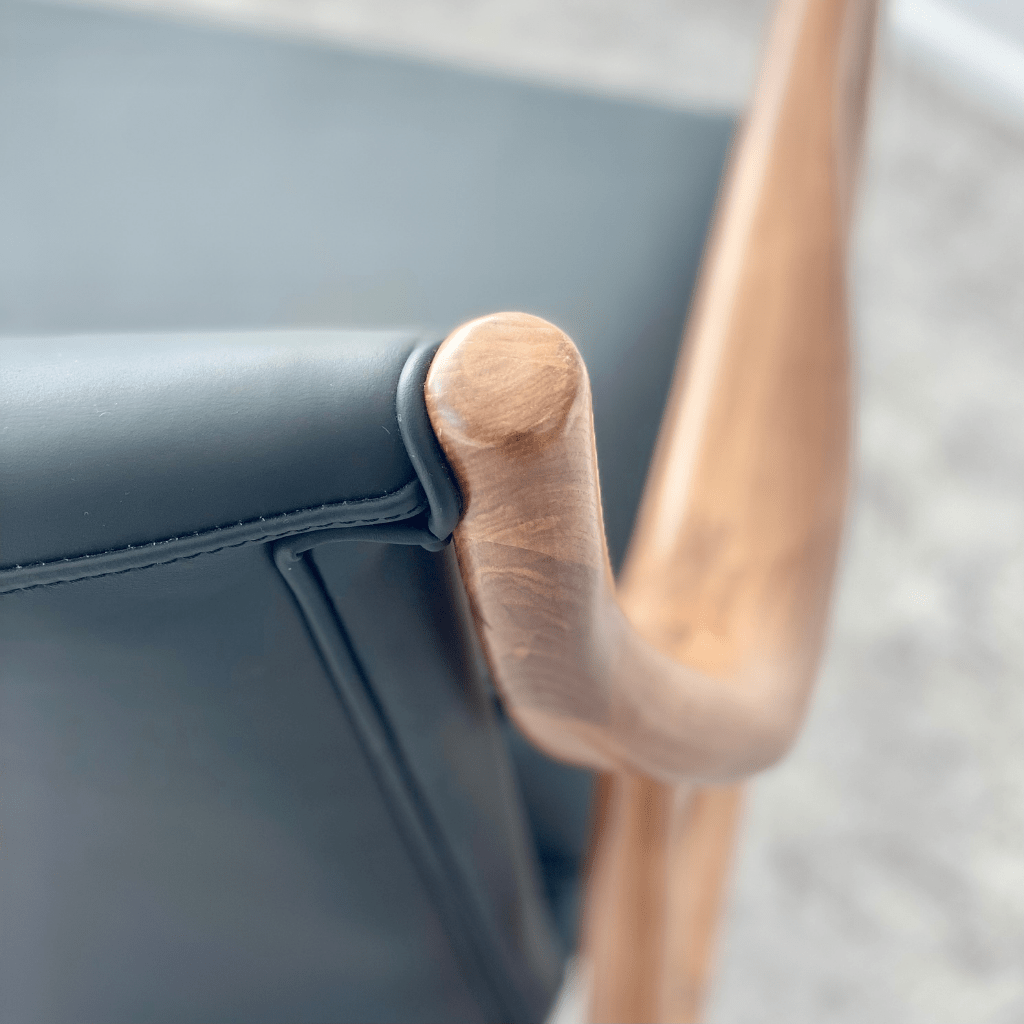 Introducing the Finn Leather Armchair, inspired by the mid-century modern furniture model. Graceful curves and premium materials make this statement piece a perfect blend of form and function. Available in sleek black leatherette or luxurious top-grain leather. Both options ensure durability and add a touch of elegance to any space.