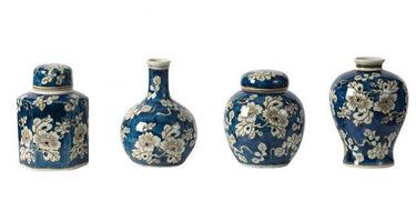 Create an elegantly coordinated look in your home or office with this beautiful set of four ceramic pieces featuring a lavish blue background, crisp white flowers, and accents of gold. These graceful jars and vases bring a cohesive look to any room. Incredibly versatile, this set fits in any room and makes an ideal way to create a custom floral arrangement that perfectly fits your style.