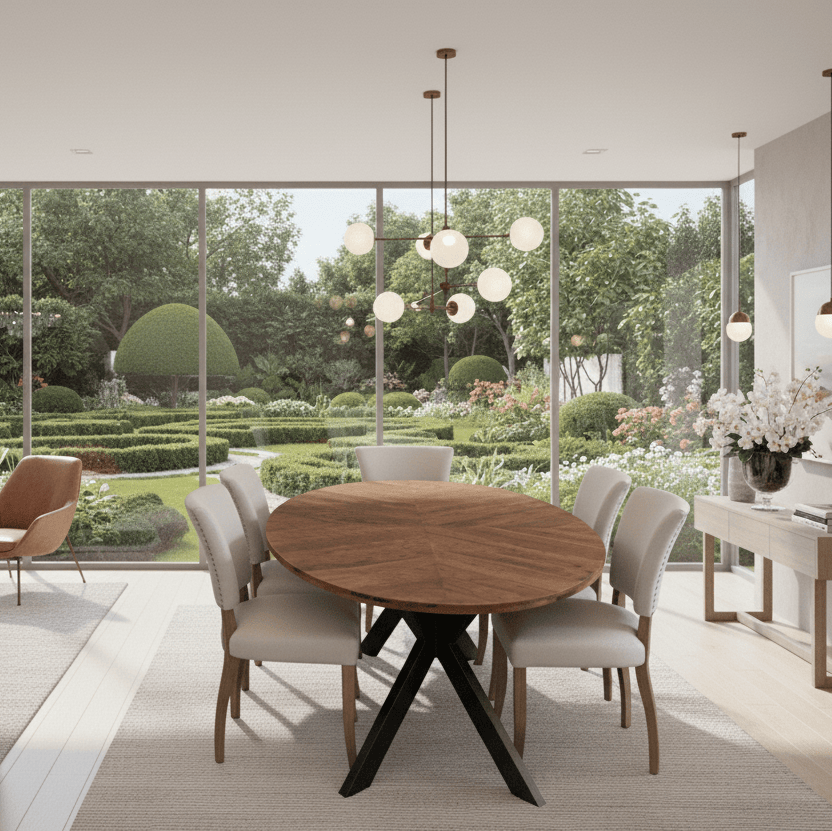 The foundation of this suite is the impressive Foundry Star Table. Crafted from reclaimed mango wood with a striking walnut finish, it features a unique sunburst timber grain pattern on its oval surface. The meticulously detailed center cross legs provide a modern, industrial-inspired base that ensures maximum legroom and rock-solid stability.