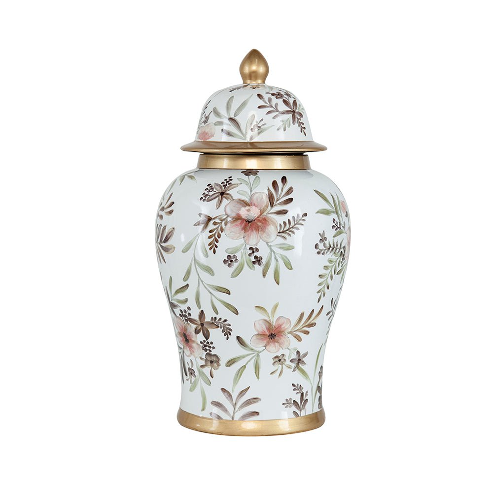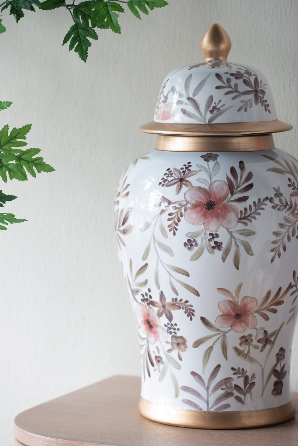 Elevate your space with this timeless Ginger Jar, constructed of high-quality porcelain. Its whimsically elegant floral pattern, gold flourishes, and smooth white finish bring sophistication to any décor. Use it as storage, a centerpiece, or a supporting accent to brighten and liven up your home.