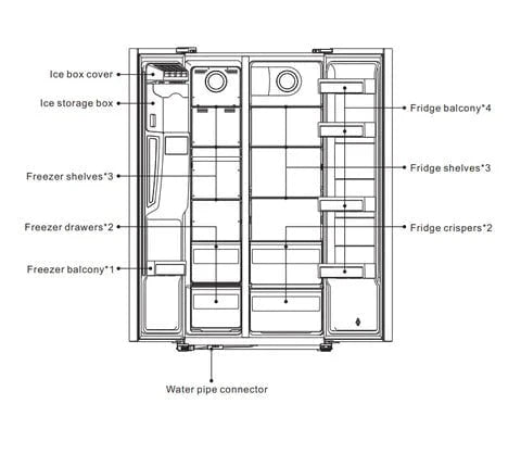 - Water dispenser- Adjustable legs- Multi-airflow- Auto defrost- Child safety lock- Temperature control panel- Fruits and vegetables box |