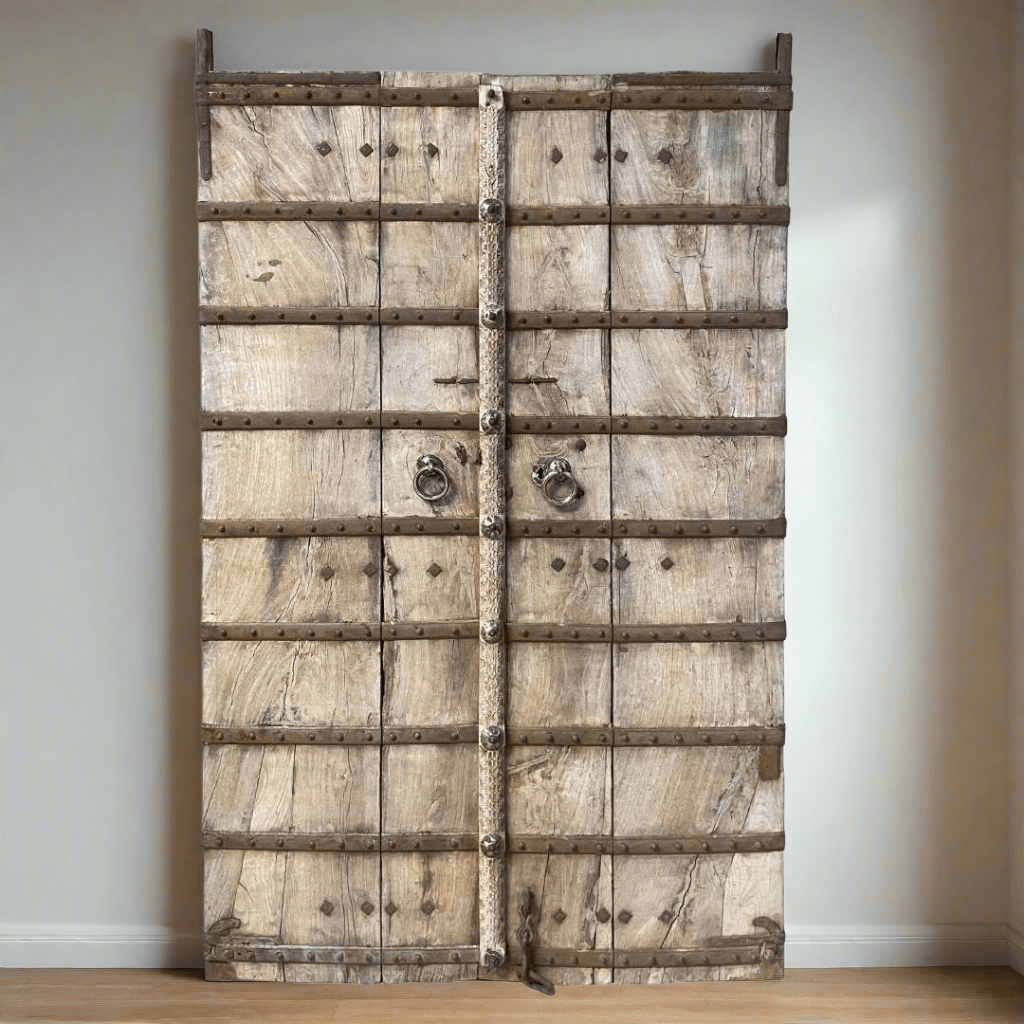Add a touch of rustic charm to your home with our Indian Vintage Wooden Door! Made from reclaimed solid teak wood, it features iron detailing for a unique design. Elevate your space with this beautiful and sustainable piece.