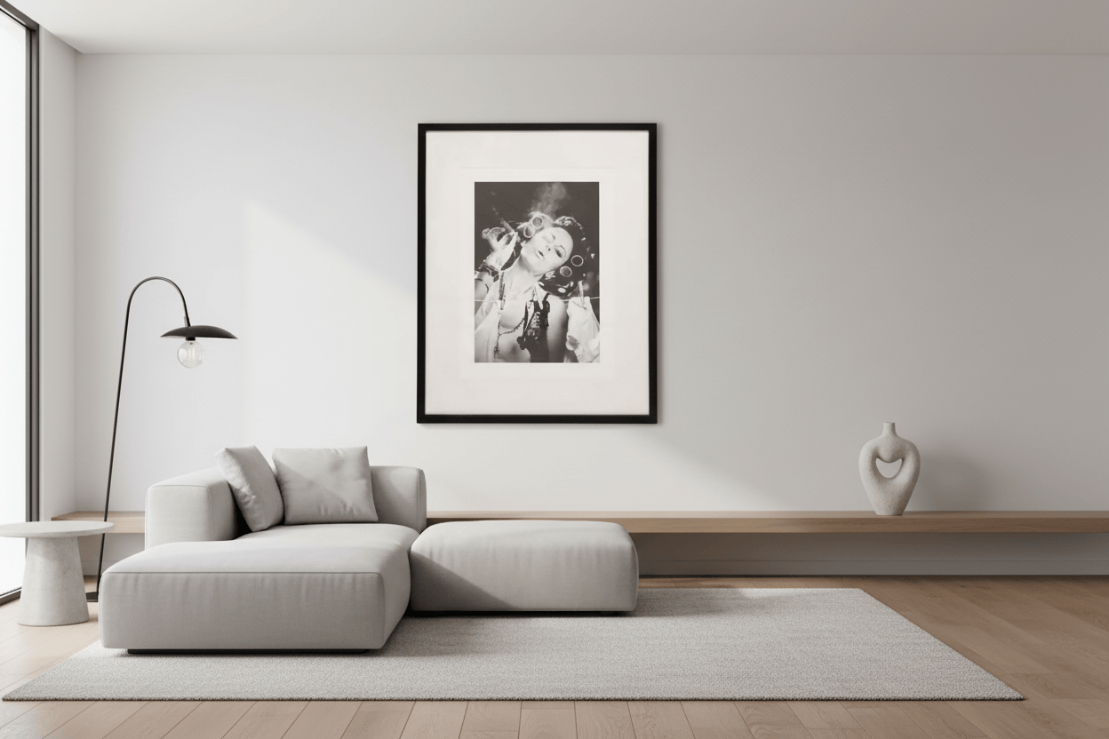 Enhance your space with the Lady with a Cigar Glass Framed Wall Art. This black and white piece features a sleek glass frame, adding a touch of sophistication to any room. Made with paper and a durable PS frame, it's the perfect addition to your home decor.