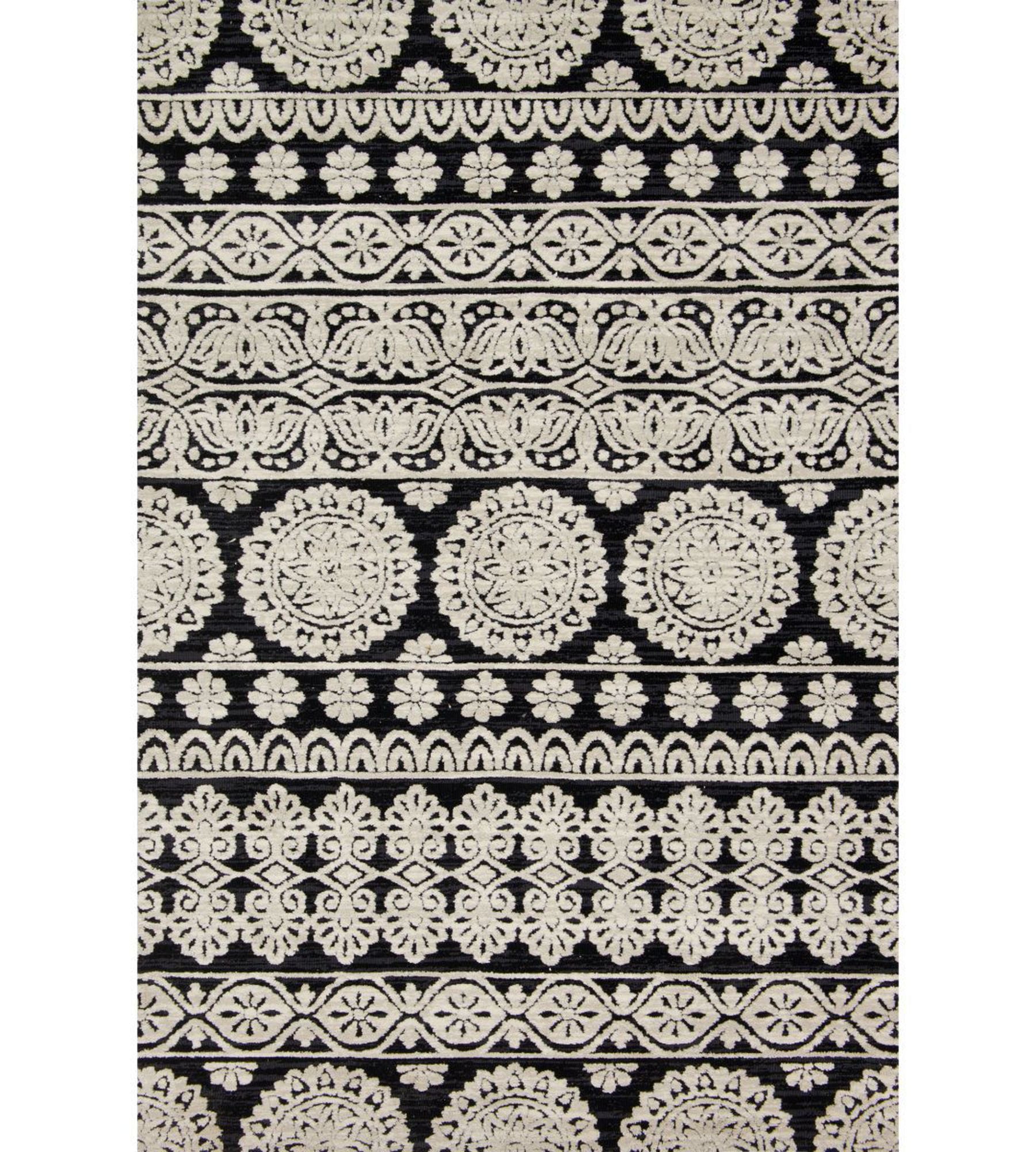 Introducing the Lotus Rug Black/Silver, a collaboration between Joanna Gaines for Magnolia Home. This plush microfiber rug features striking patterns and high contrast for a functional and stylish addition to your home. Made from 100% polyester yarns and power-loomed in China, it's a statement piece that will last for years.