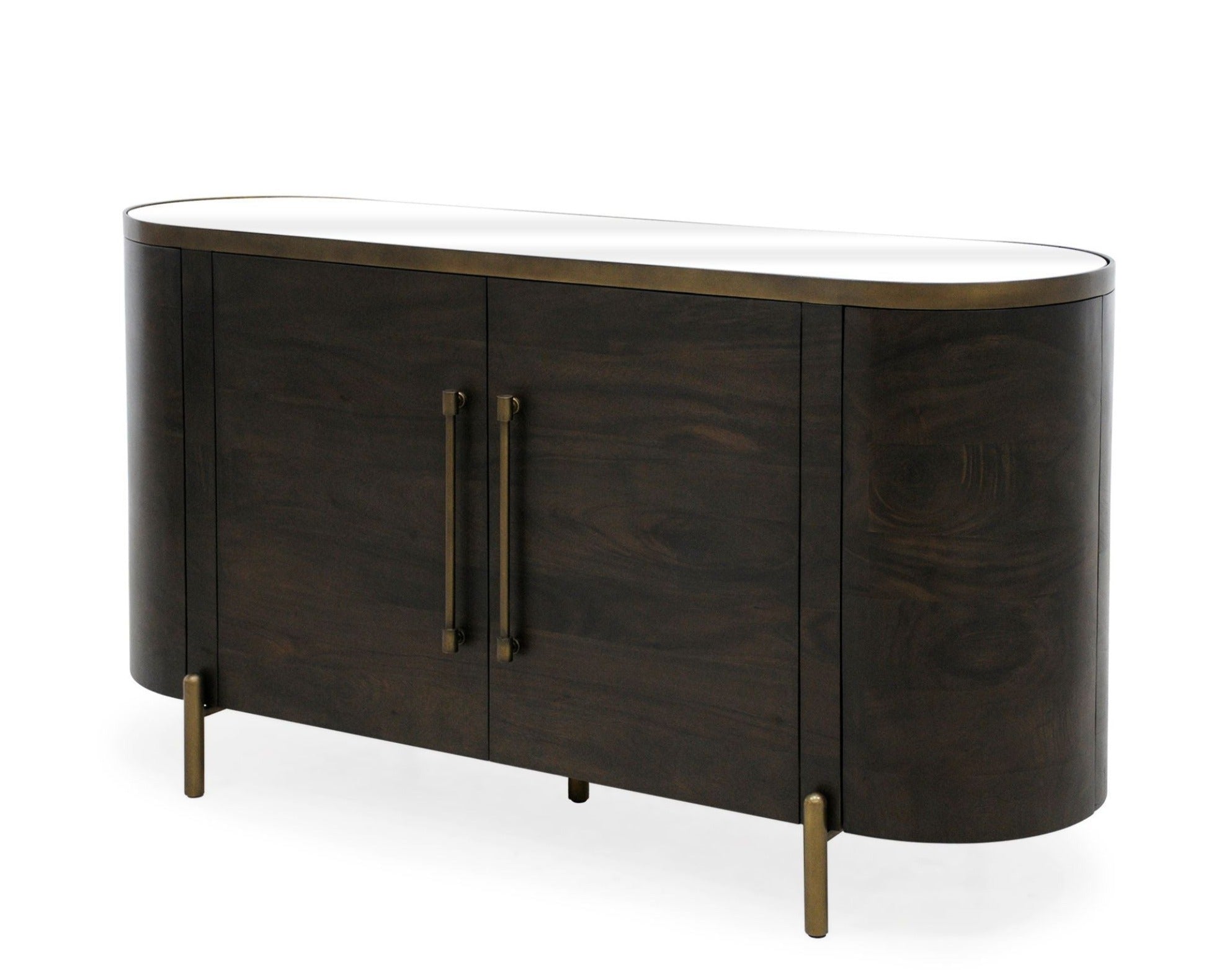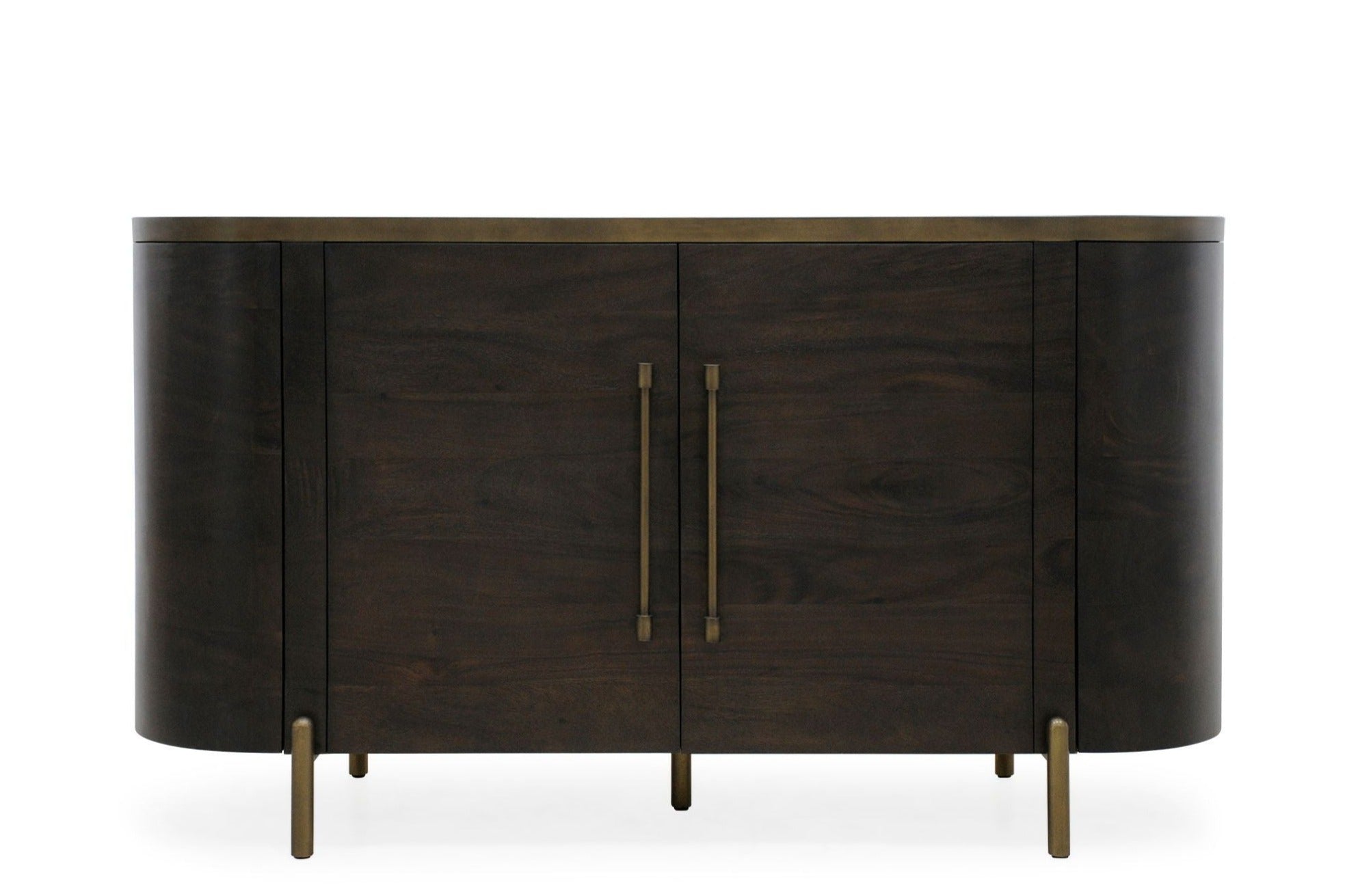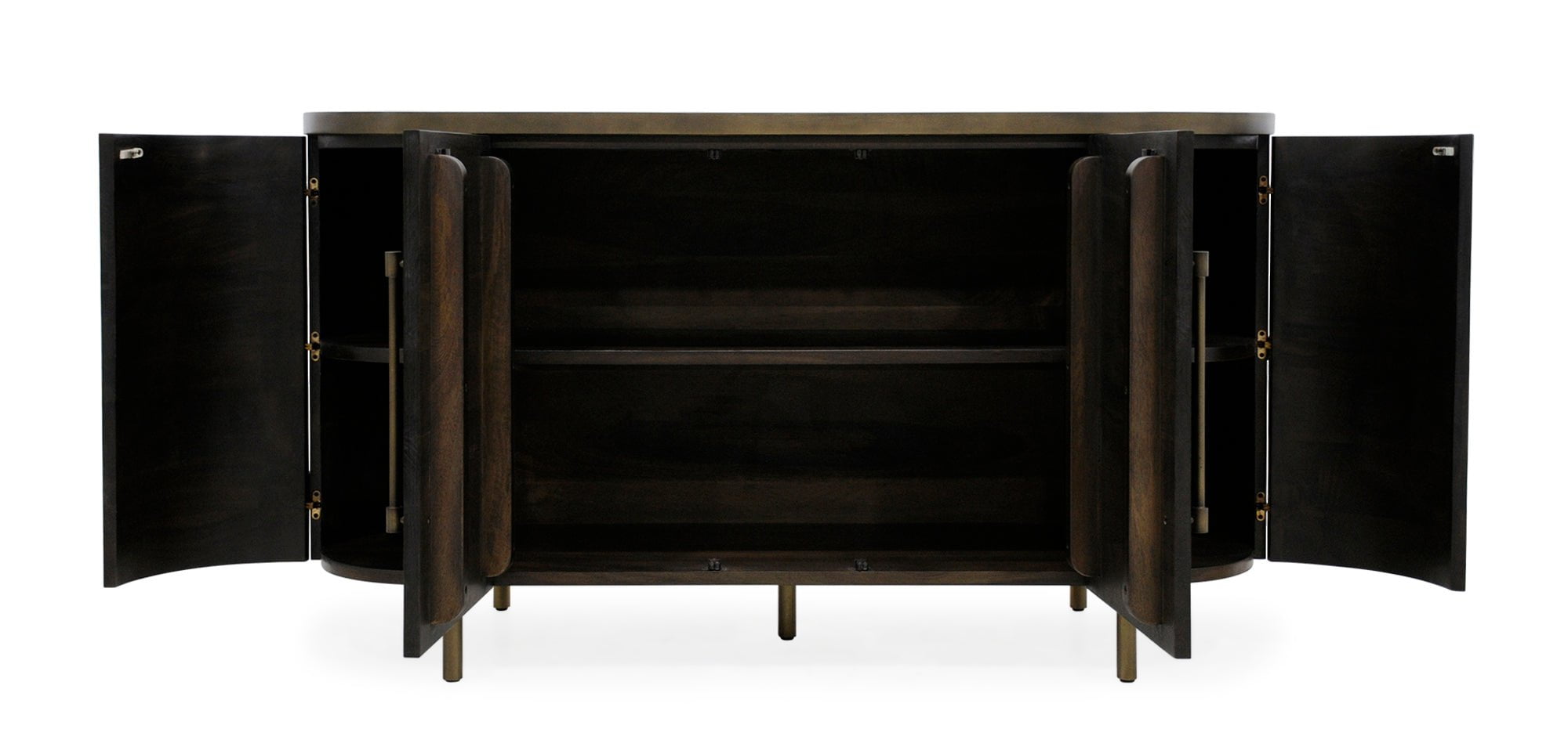 This stunning 4-Door sideboard is crafted with warm iron brown and brass finished mango timber, a mirrored top, and brass accents. Perfect for storage, its middle shelf offers even more opportunities to display your favorite items. Make a statement with this stylishly sophisticated sideboard.