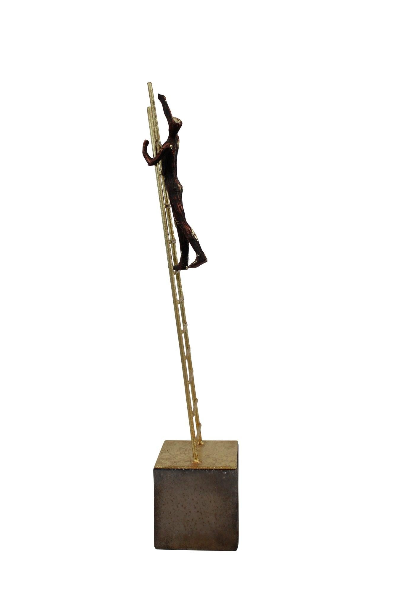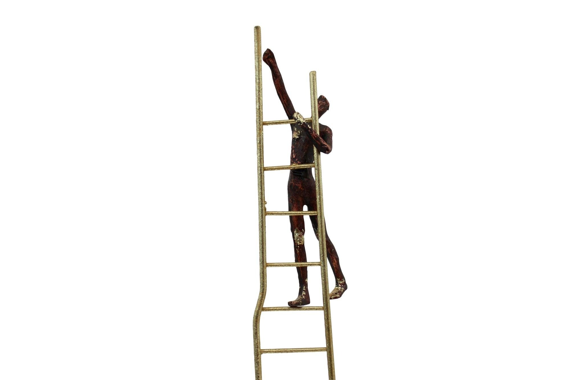 Add a touch of inspiration and artistic flair to your space with the Man Climbing on Ladder sculpture. Crafted from durable resin and finished in striking tones of black, verdigris, and gold, this piece captures the essence of determination and progress.