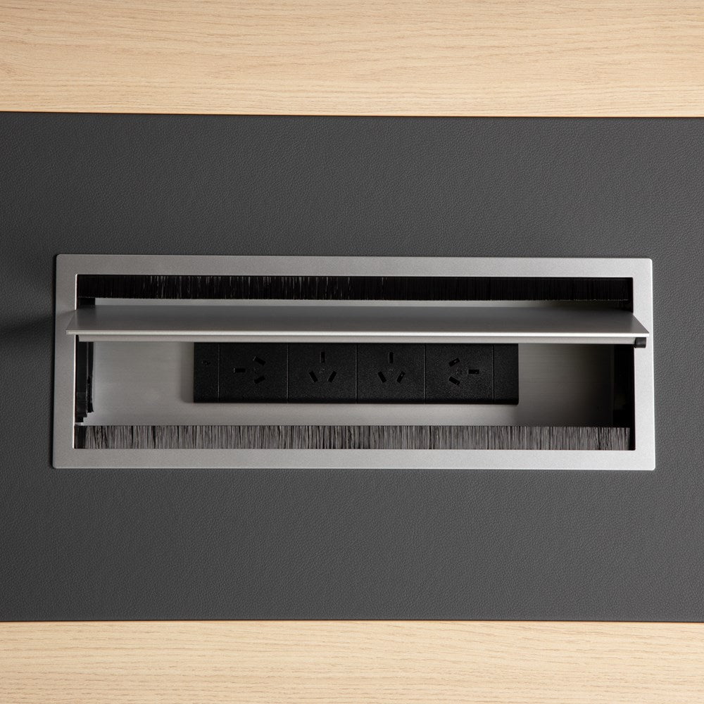 Aluminium double-sided flip-up wire boxes to conceal wires and cords, includes quad GPO per power box.