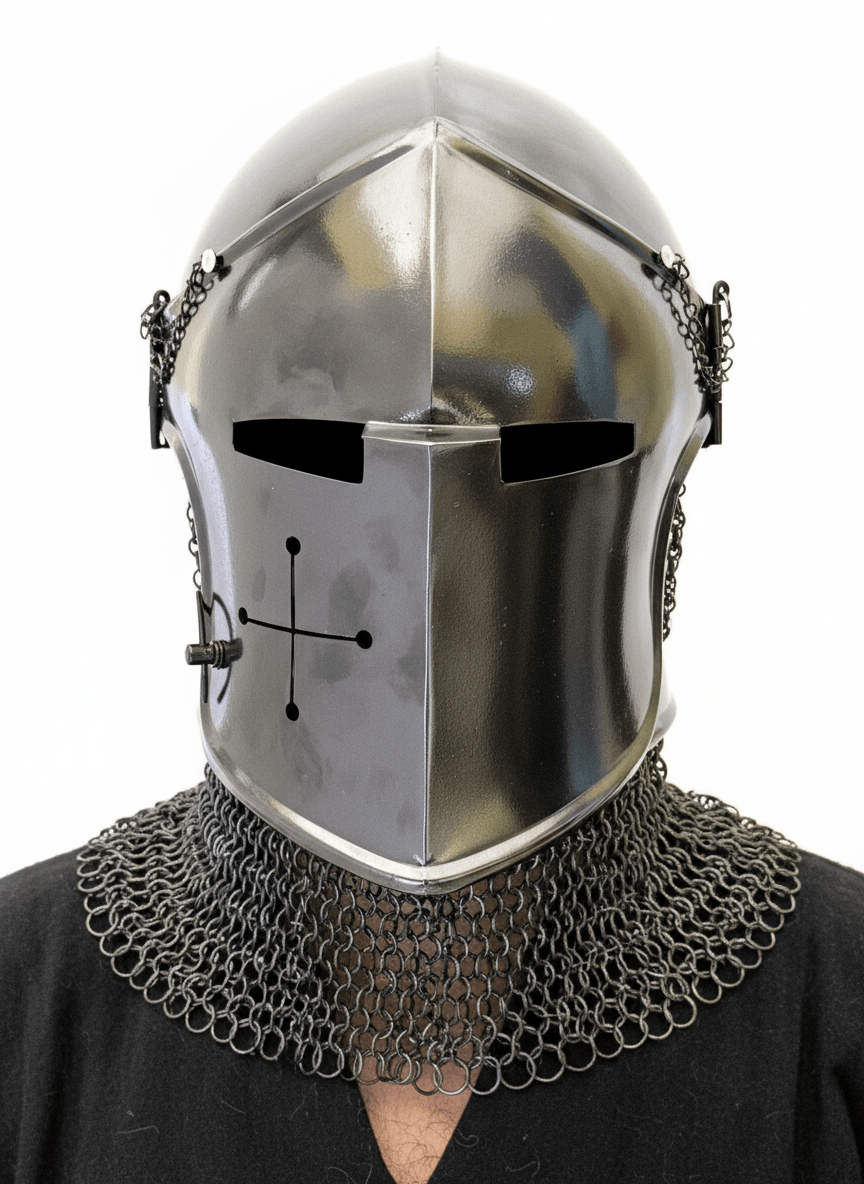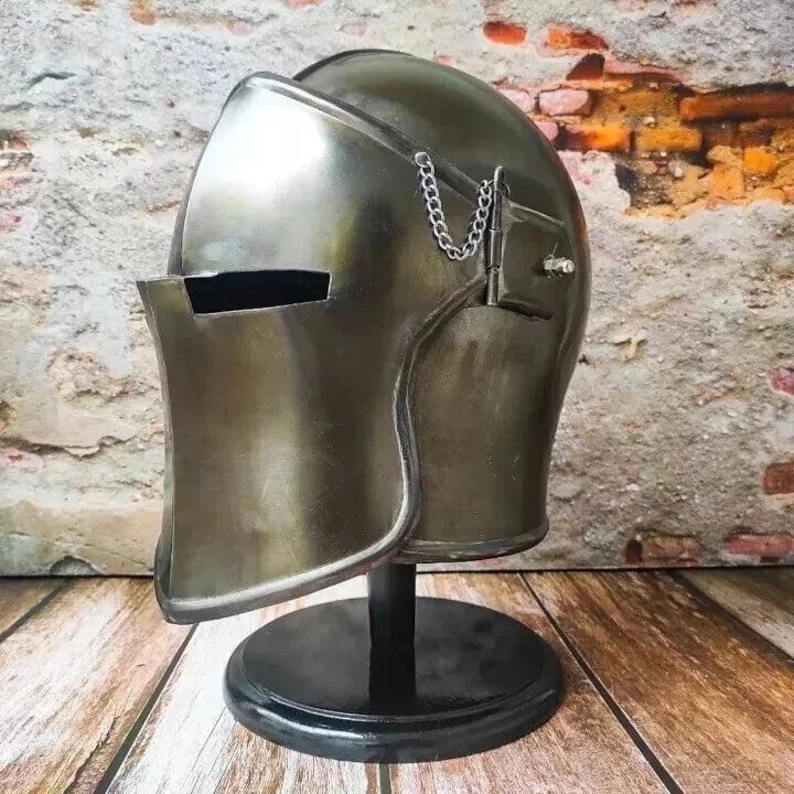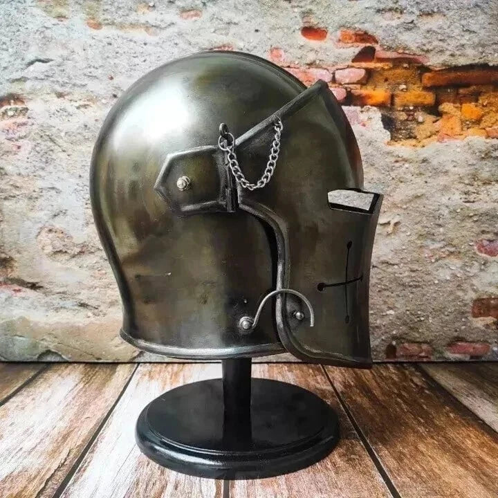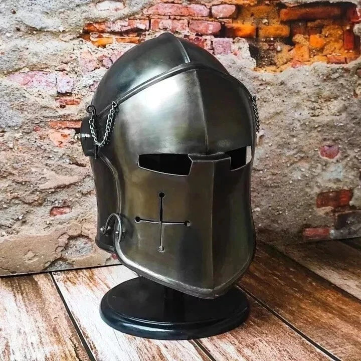 Crafted from 18-gauge mild steel with a wooden stand, this black Medieval Knight Helmet offers a fully wearable adult size design weighing approximately 2 kg. It features a pre-fitted padded liner for comfort, making it ideal for reenactments, SCA events, and role play.