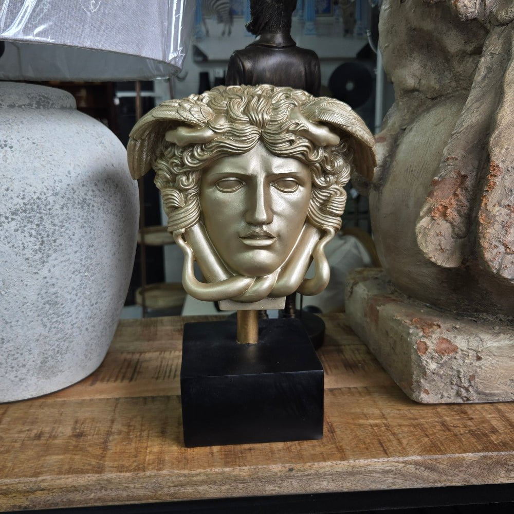 Introducing the captivating Medusa Statue on Stand in stunning black and gold colours. Made with durable polyresin, this statue will add a touch of elegance and mystery to any room. Let its intricate details and bold design inspire you and add a touch of luxury to your space.