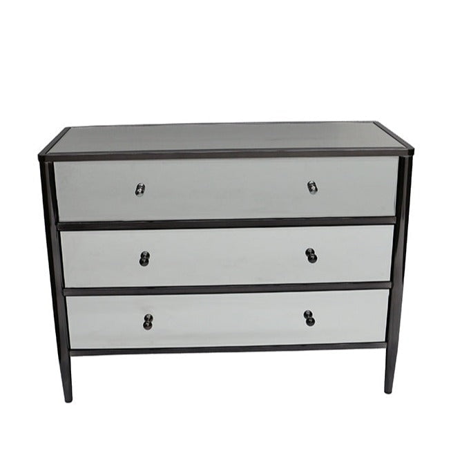Elevate your space with the Mirror Commode in stylish black and nickel. With 3 spacious drawers, this piece not only adds a touch of sophistication, but also provides ample storage. Transform your room into a luxe retreat with this must-have piece.