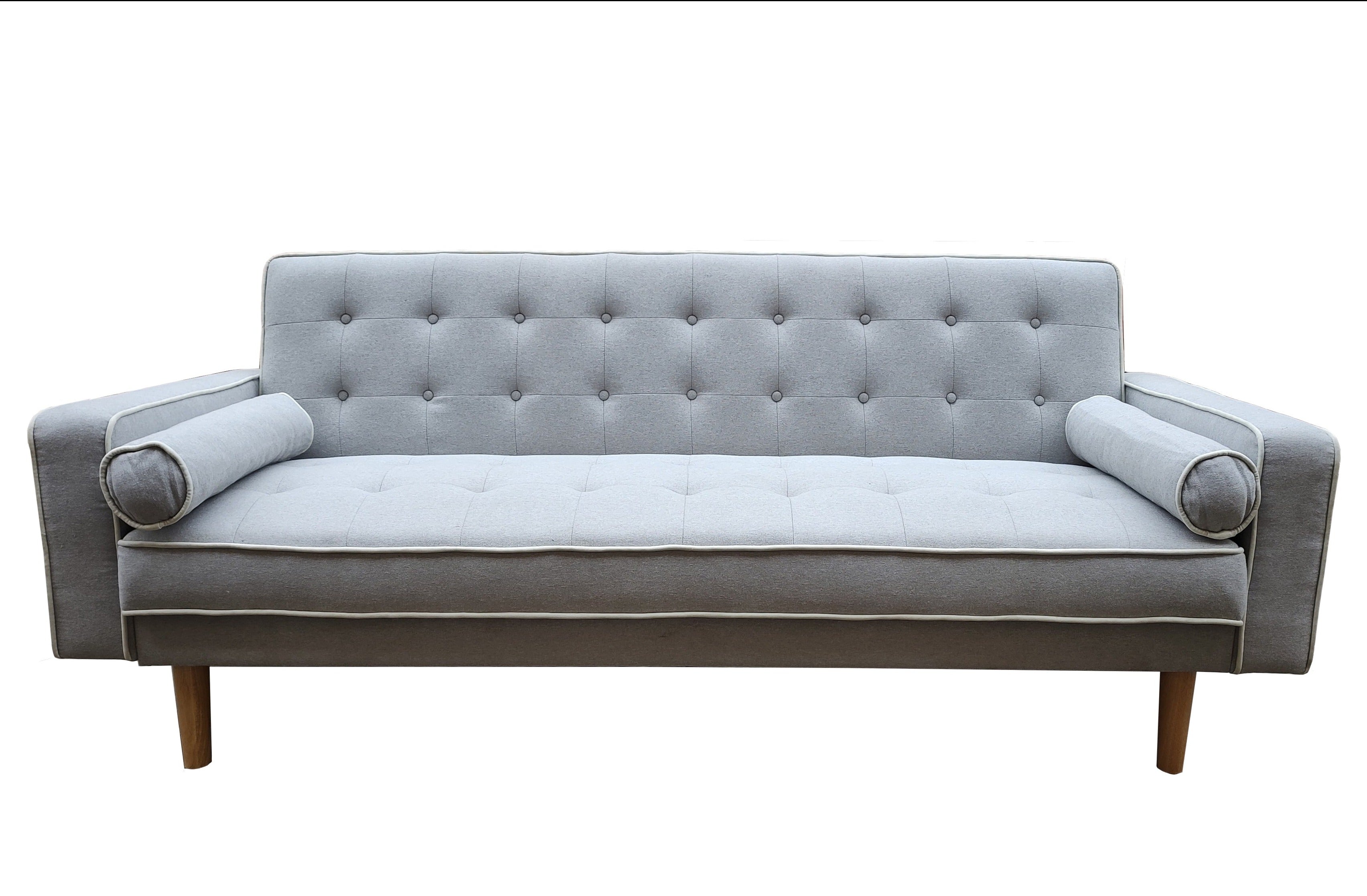 Discover the ultimate in luxury and comfort with the New York Sofabed - Grey with white piping. Its plush top cushioning, high-quality material, and sturdy wooden legs make it the perfect choice for stylishly accommodating guests without sacrificing space. Easily switch between sofa, lounger, or bed with a simple click-clack action. Make a statement and elevate your living space with this fashionable and functional furniture!