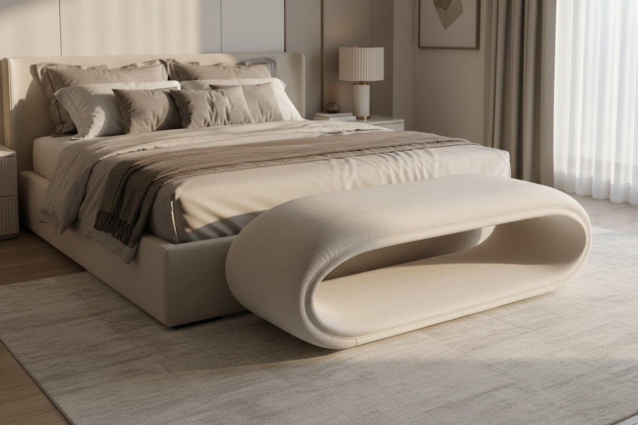 The Orbit Bench Seat is the ultimate fusion of sculptural art and functional comfort. Dressed in a sophisticated Turtledove polyester fabric, this piece features a signature pill-shaped silhouette and a unique "negative space" arched base that adds architectural depth to any room. Whether placed at the foot of a bed, in a minimalist entryway, or as extra seating in a contemporary lounge, the Orbit Bench is a masterclass in modern curves.