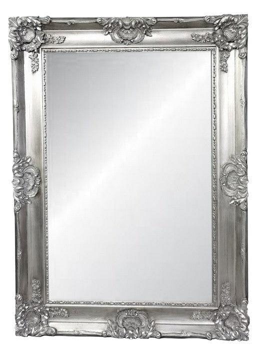 Designed to rest comfortably on the floor against the wall or hanging on the wall, this mirror is a bevel edged mirror, set inside a mahogany frame and adorned with intricate and detailed handcrafted carvings which is set off by the beautiful Silver lacquer finish.