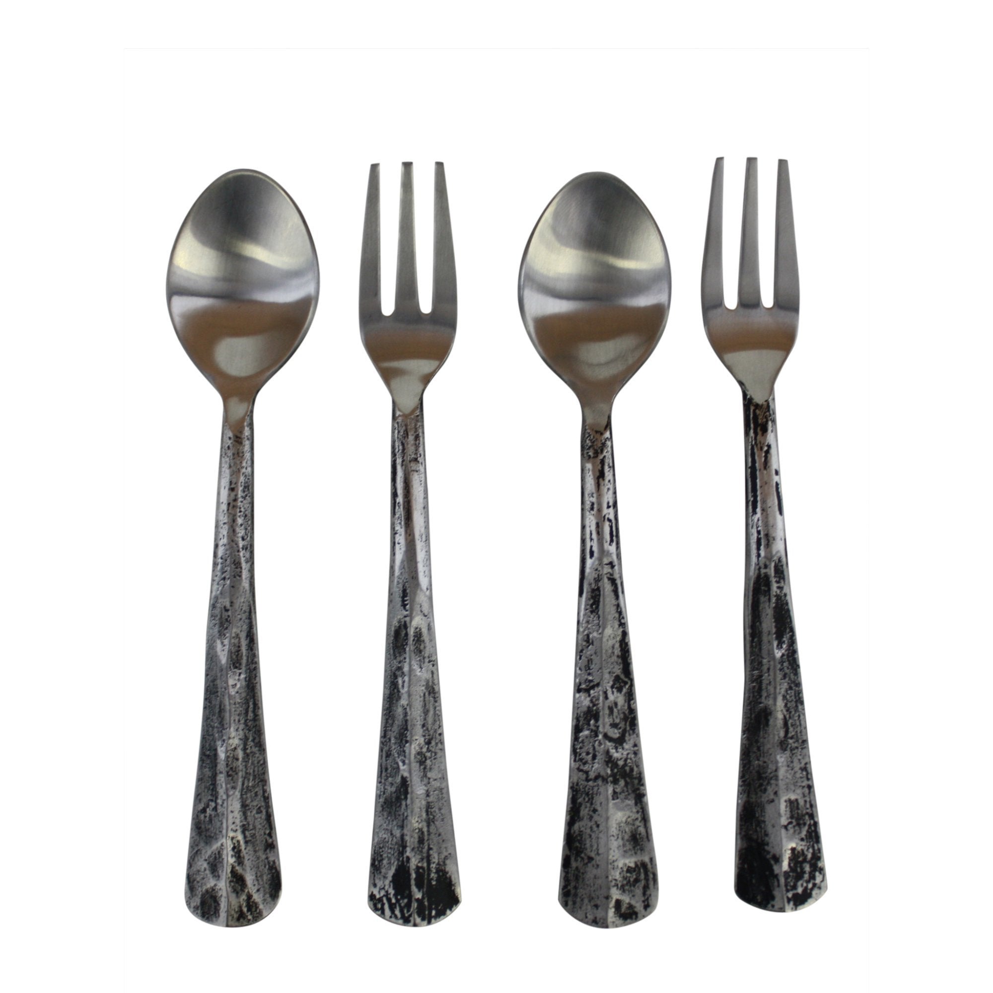 Add a touch of elegance to your dining experience with our Raw Look Spoon & Fork Set/4 in antique silver. Made from high-quality steel, these utensils combine a raw and vintage look for a unique and sophisticated aesthetic. Enhance your table setting with this luxurious set today.