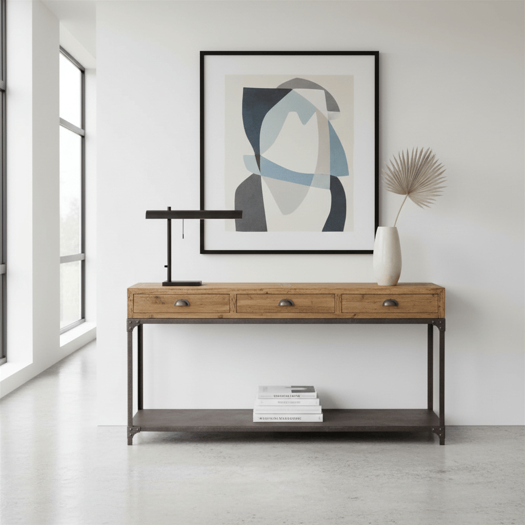 This reclaimed console table blends industrial strength with country charm, featuring warm timber surfaces paired with sleek metal accents. Designed with three spacious drawers, it offers practical storage while enhancing hallways, living rooms, dining areas, or office spaces with its refined, versatile style.