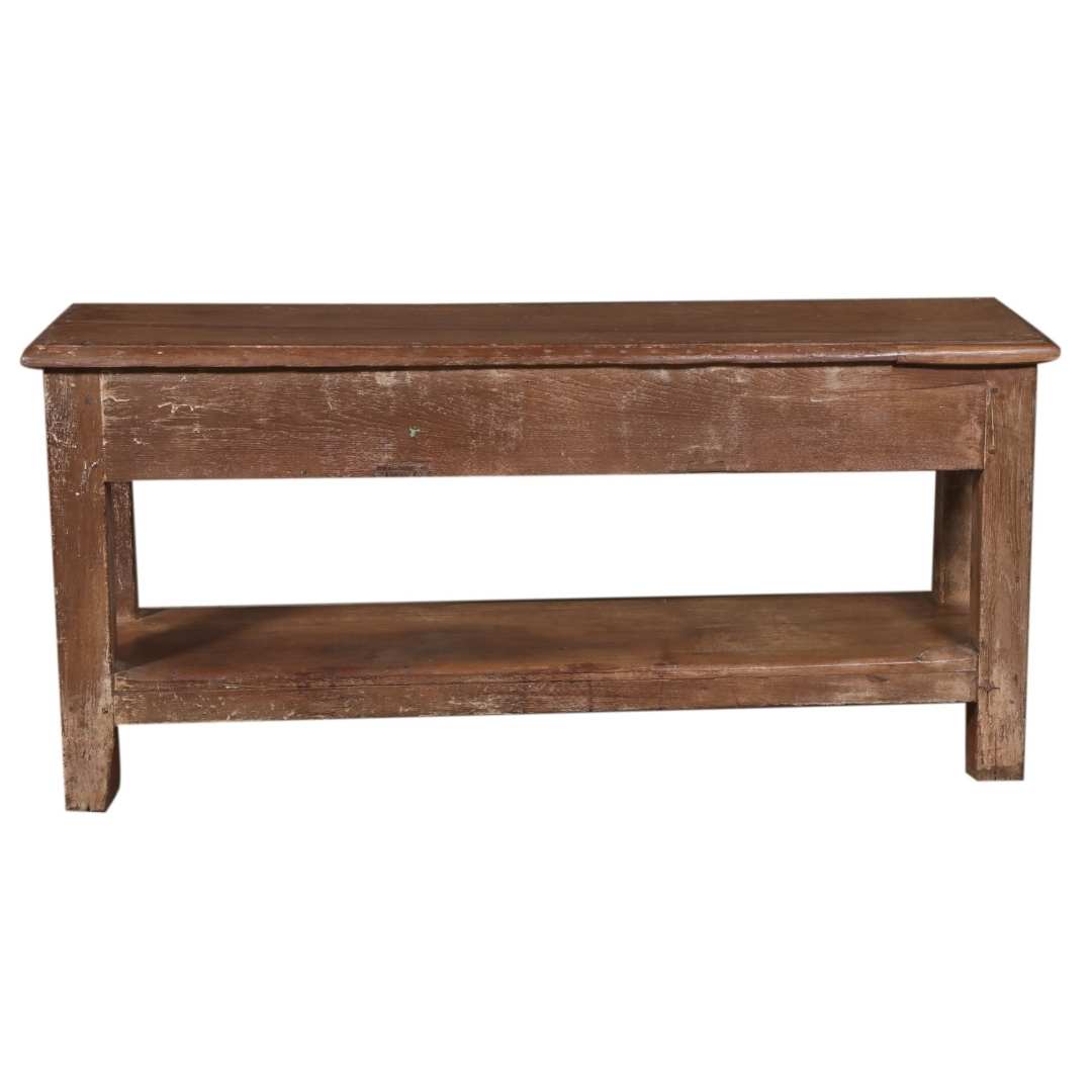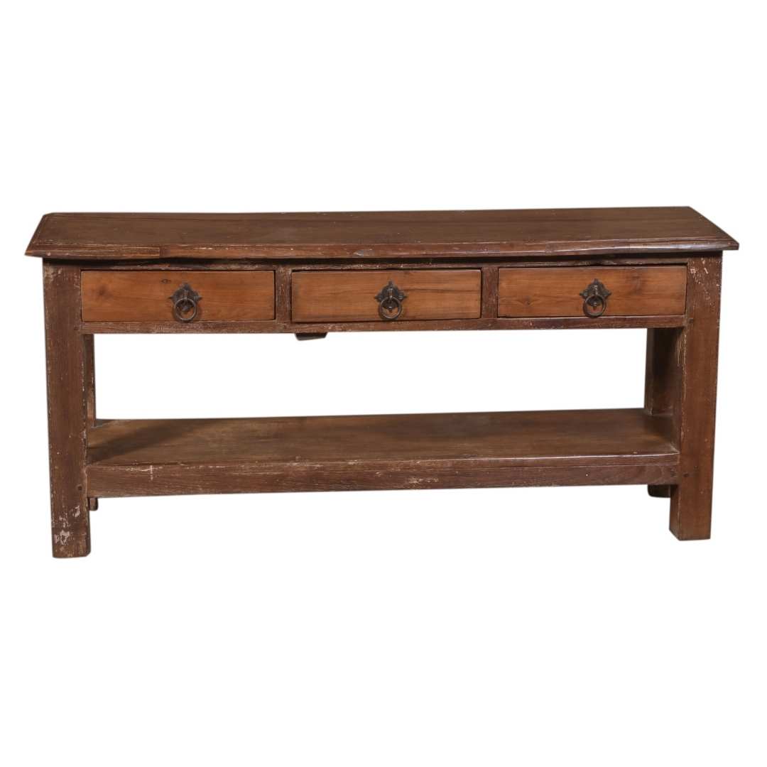 This reclaimed vintage console table, finished in natural tones, offers elegant storage with three spacious drawers and a sturdy bottom shelf. Its weathered wood and subtle grain patterns evoke rustic charm, seamlessly blending with both modern and traditional decor. Ideal for entryways, living rooms, or dining areas, it provides a refined way to organize essentials and display treasured items, adding timeless sophistication to your home.