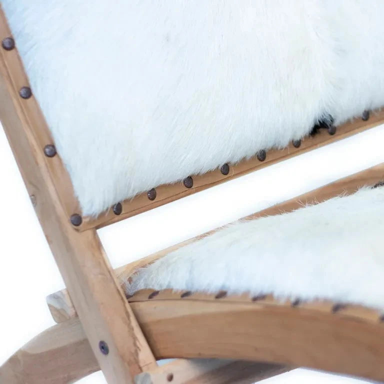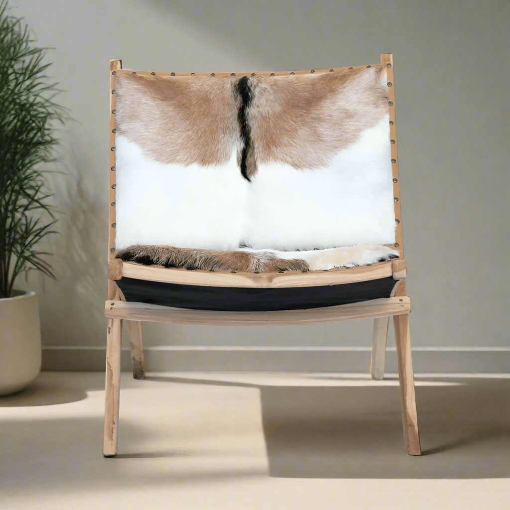 This generously-sized goat-hide chair exudes a relaxed, modern farmhouse vibe perfect for your living room. Use as a stylish statement piece or as extra seating when needed. Lightweight and straightforward to move, it conveniently folds up and away when not in use.