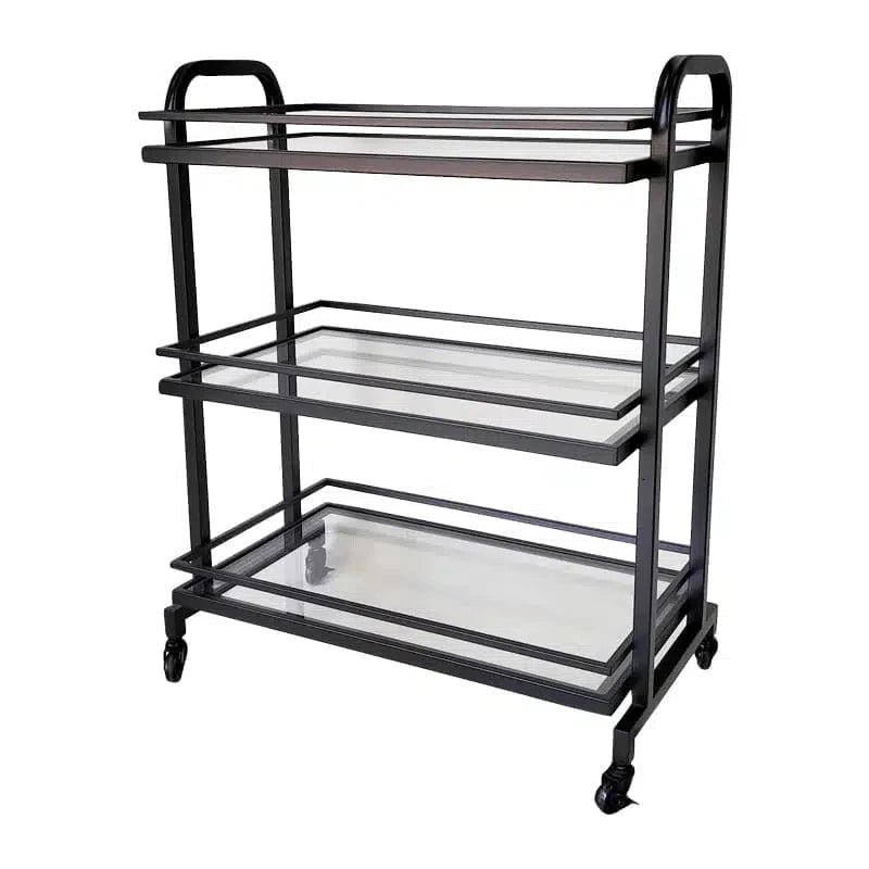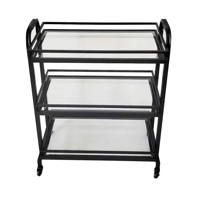 Bring elegance and practicality to your entertaining space with the Samui Bar Cart. Featuring a sleek black iron frame paired with clear glass shelves, this cart combines modern design with functional storage. Perfect for serving drinks, displaying glassware, or organizing your bar essentials with style.