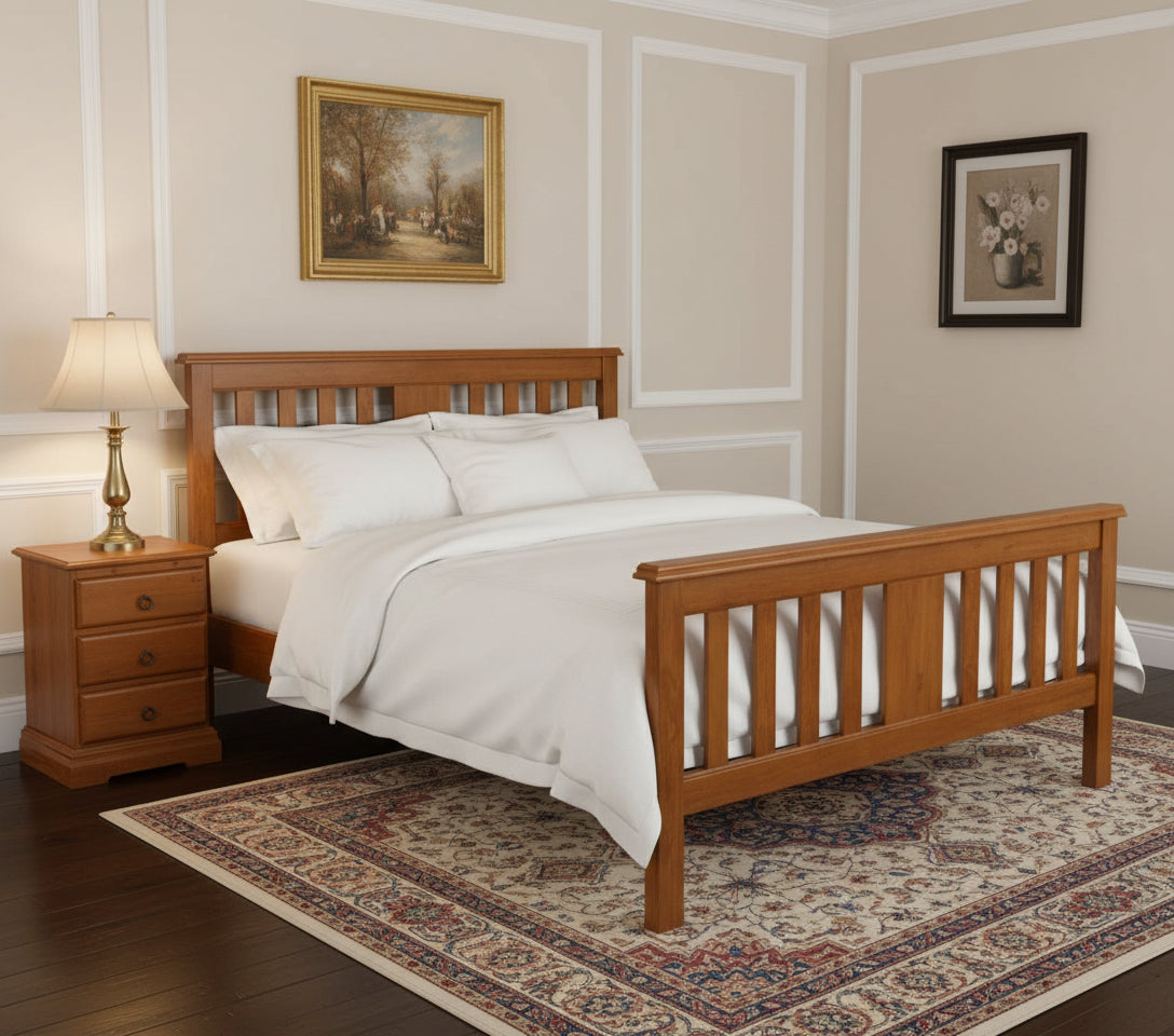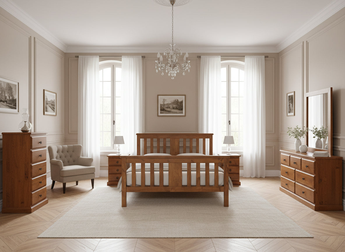 Create a dream oasis in your bedroom with the Scarlett Queen Bedroom Suite 4 Pcs. The solid pine bed frame features a beautiful slatted headend and a low foot-end that helps create the illusion of space. Enjoy a comfortable night's sleep on a solid slatted base that accommodates any mattress. Drift away peacefully and enjoy a restful night in your home sanctuary.