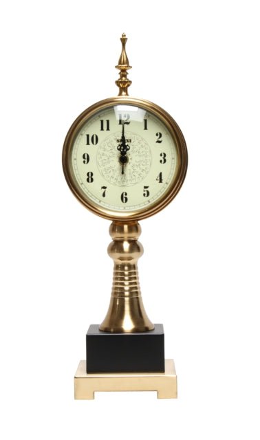 Introducing our elegant Table Clock in Antique Gold! Made with a combination of metal and wood, this mantel clock will add a touch of sophistication to any room. Keep track of time in style and elevate your home decor.