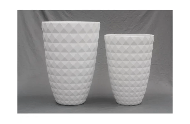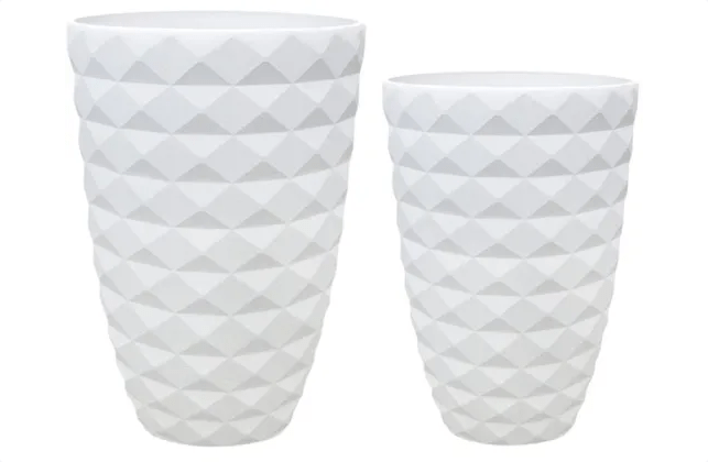 Elevate your outdoor space with this Set of 2 TALL DIAMOND RESIN PLANTERS. Made with durable resin, these planters are not only aesthetically pleasing, but also practical for your plants' growth. Add a touch of elegance and functionality to your garden or patio today!