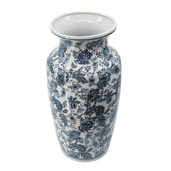An urn-shaped vase is adorned with a classic chinoiserie pattern. A tapered neck adds voluptuous appeal to this vase, while the blue and white finish accentuates the traditional pattern.