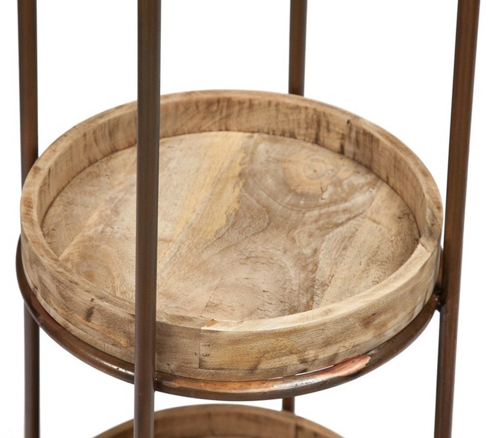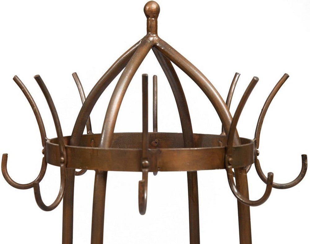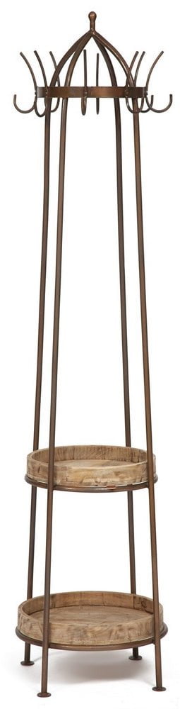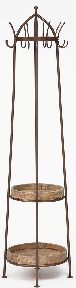 This vintage, tall coat hanger will lend itself well to any entry way. Made from antiqued metal and featuring wooden shelves near the base, this piece plays on the contrast of the warm wood and cool metal. A great piece for rustic or vintage inspired homes.