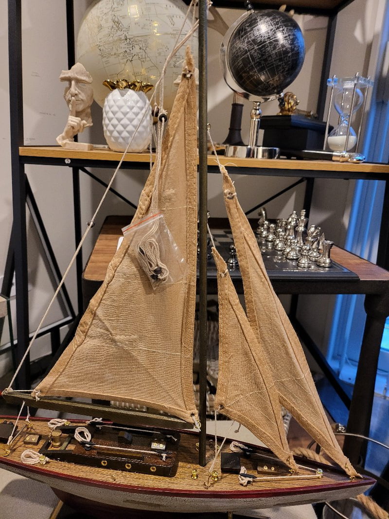 Experience the luxury and elegance of our Yacht Model in a smaller size. Made with high-quality wood and linen sails in a rich brown color, this model is a beautiful addition to any nautical-themed decor. Perfect for yacht enthusiasts and those looking to add a touch of sophistication to their home.